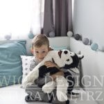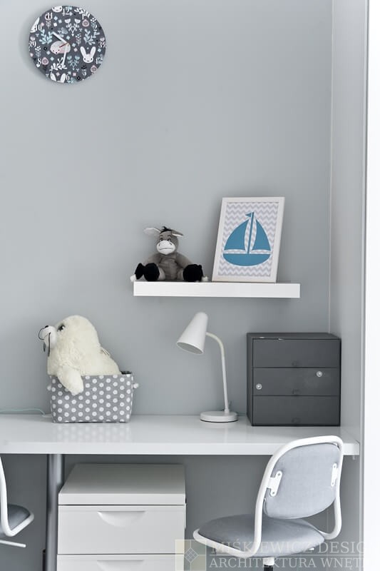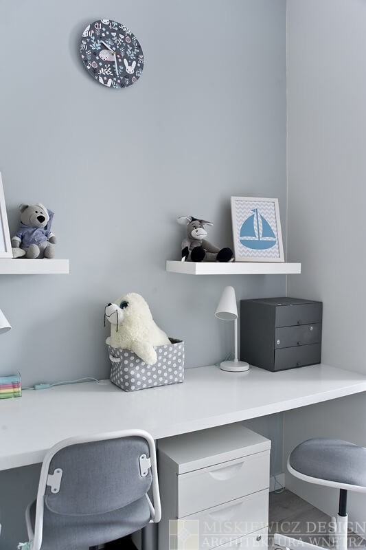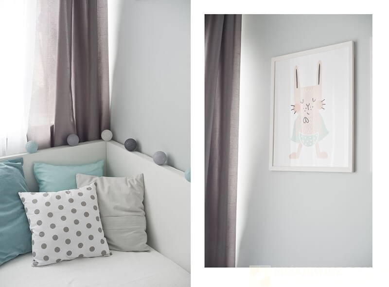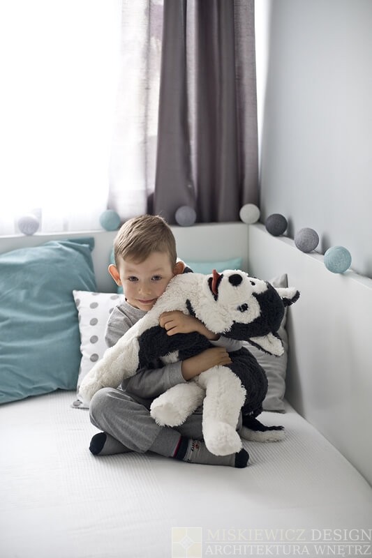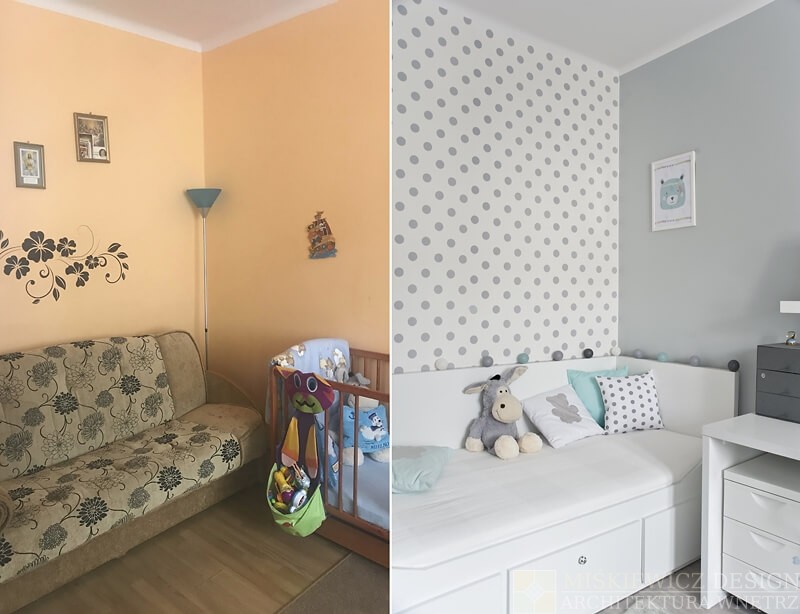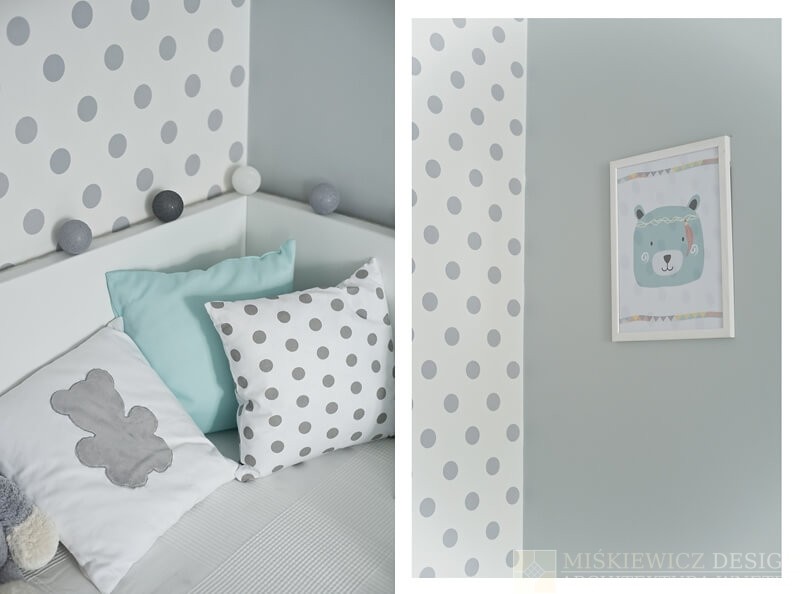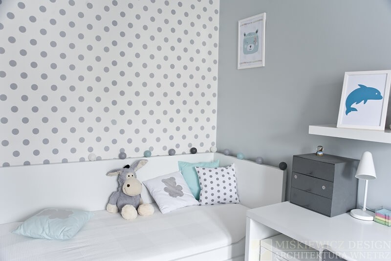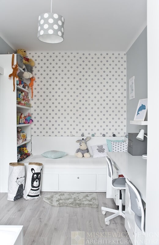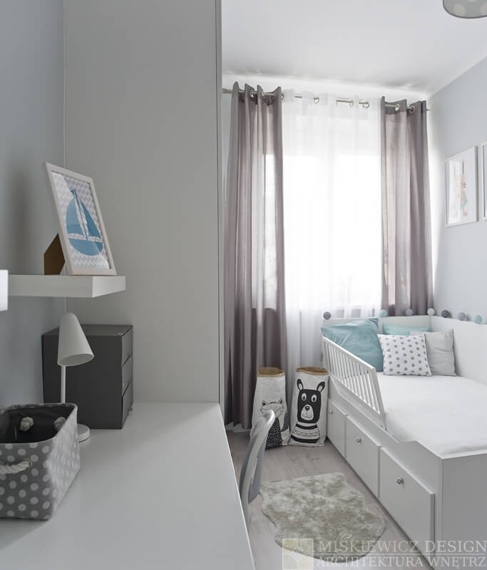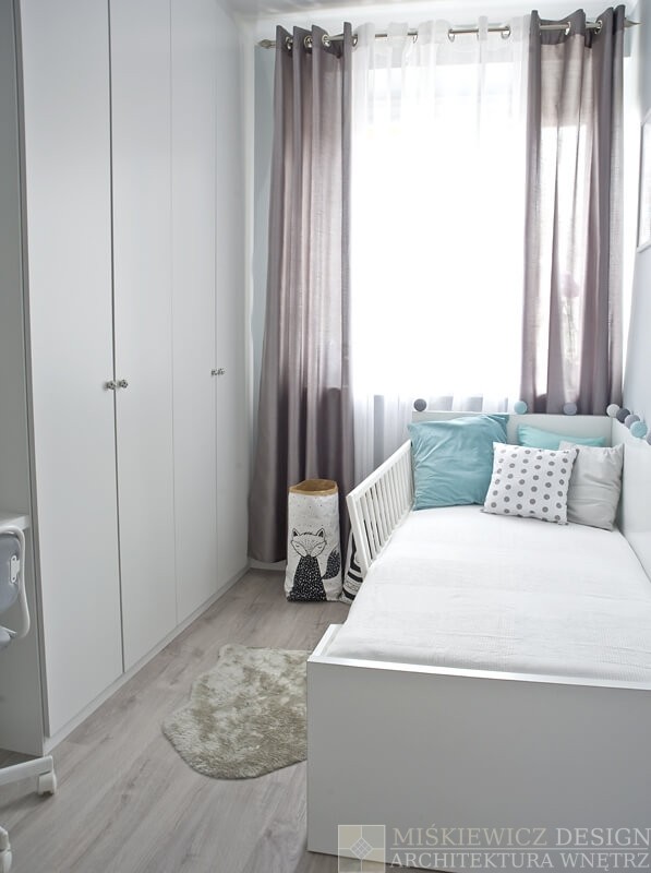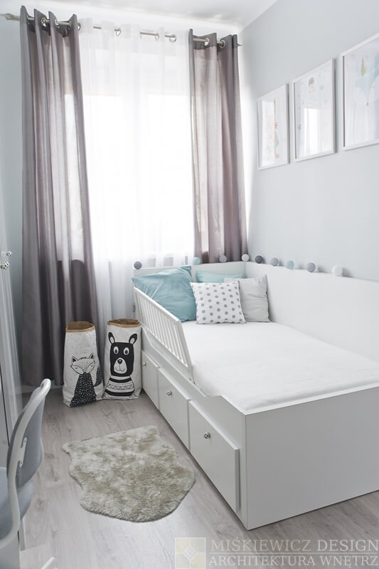 Nowe, drewniane białe meble są praktyczne, będą rosnąć wraz z dzieckiem i posłużą przez długie lata. Zrezygnowaliśmy z sofy na rzecz łóżka z dużymi szufladami. Wspaniałe miejsce na chowanie dziecięcych zabawek i pościeli. Bardzo łatwo będzie też odświeżyć optycznie to białe wnętrze wymieniając dodatki. Na razie akcenty kolorystyczne to delikatne szarości z dodatkiem mięty.