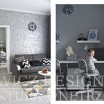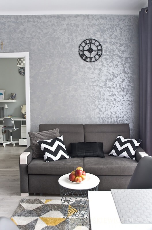 Wszystkie ściany mają teraz neutralne kolory w odcieniach szarości co uspokoiło wnętrza. Ściana za kanapą, pokryta dekoracyjnym tynkiem ma szary kolor ale dzięki odbijaniu światła i nierównej fakturze nie przytłacza a rozjaśnia wnętrze.