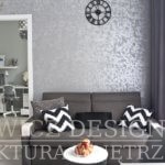 W salonie nowa sofa stoi w innym miejscu niż poprzednia co pozwoliło wygospodarować więcej wolnej przestrzeni. Ściana za sofą jest pokryta nowoczesnym, lekko połyskującą srebrem tynkiem.