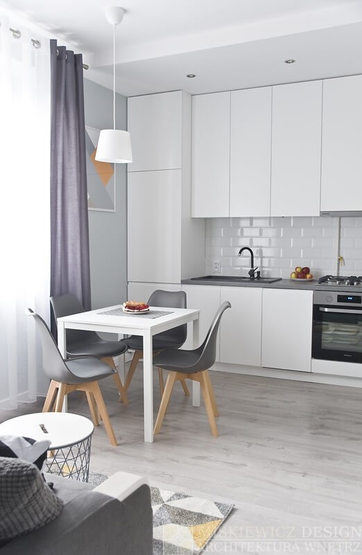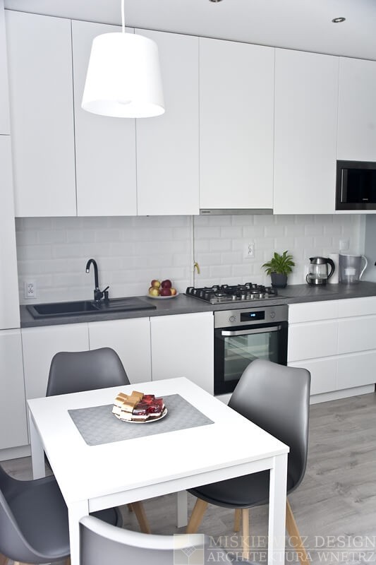 Stół będący łącznikiem między kuchnią a salonem nie zmienił swojego pierwotnego miejsca i nie stracił nic na funkcjonalności. Nadal jest to wygodne miejsce do spożywania posiłków. Zmienił za to całkowicie styl z tradycyjnego na prosty nowoczesny design. Jest biały tak jak szafki kuchenne a krzesła, które go otaczają mają nowoczesną lecz bardzo wygodną formę i są w kolorze kuchennego blatu.
