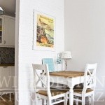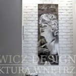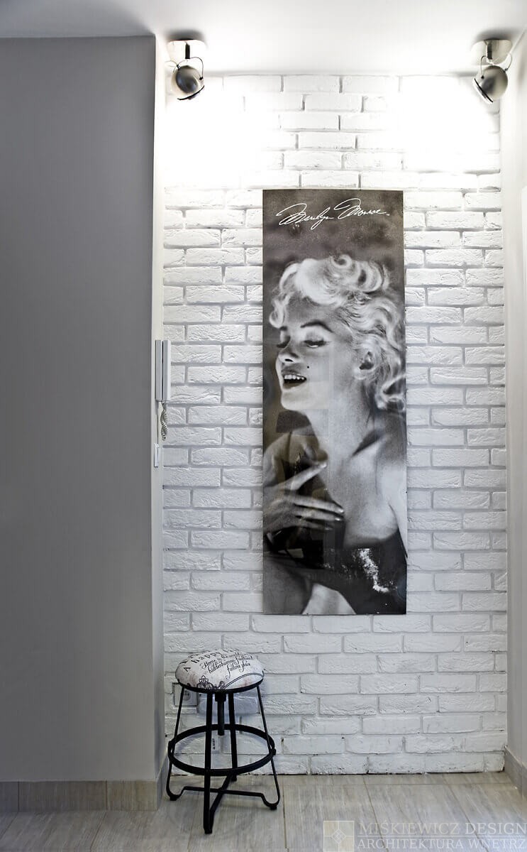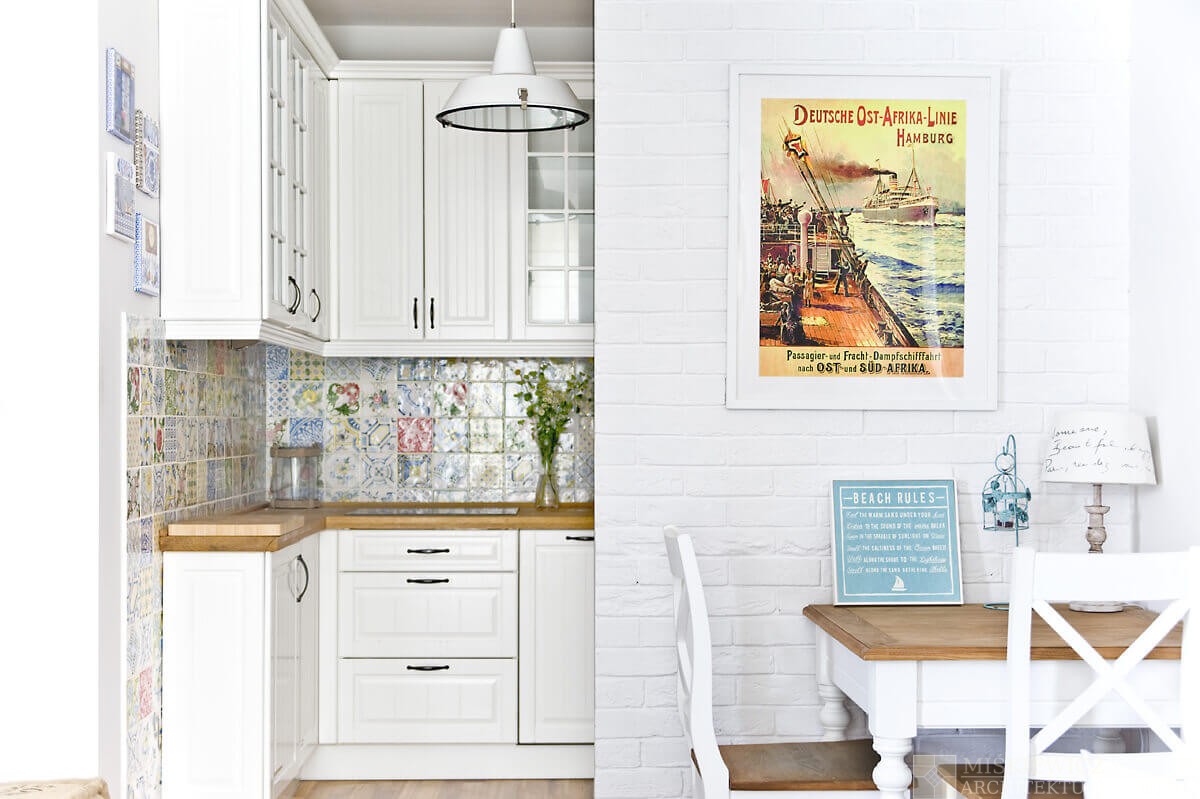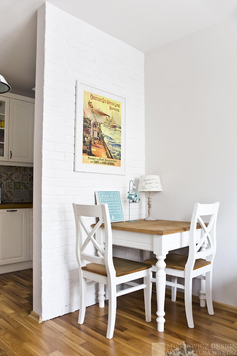 Biała cegła na ścianie oraz duże plakaty z rysunkami statków parowych, którymi pasjonuje się właściciel, dopełniły charakteru.