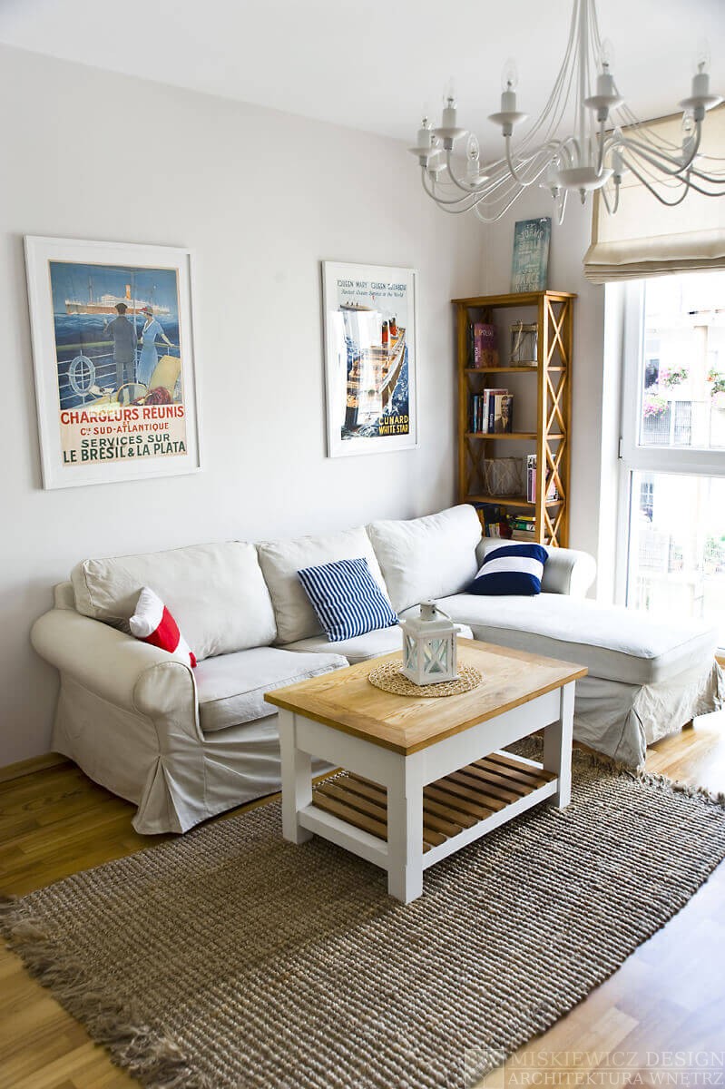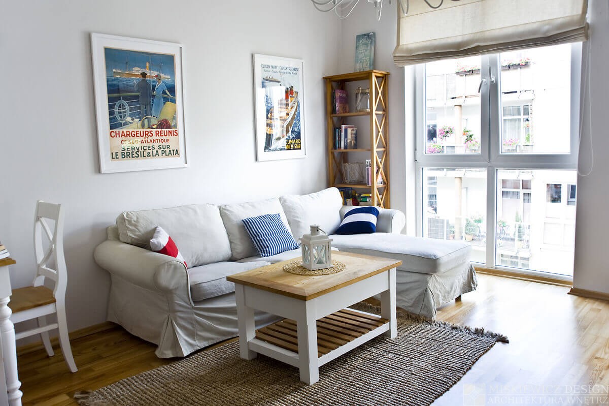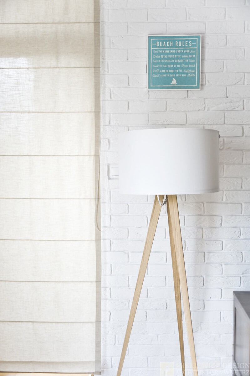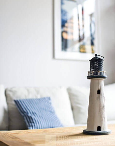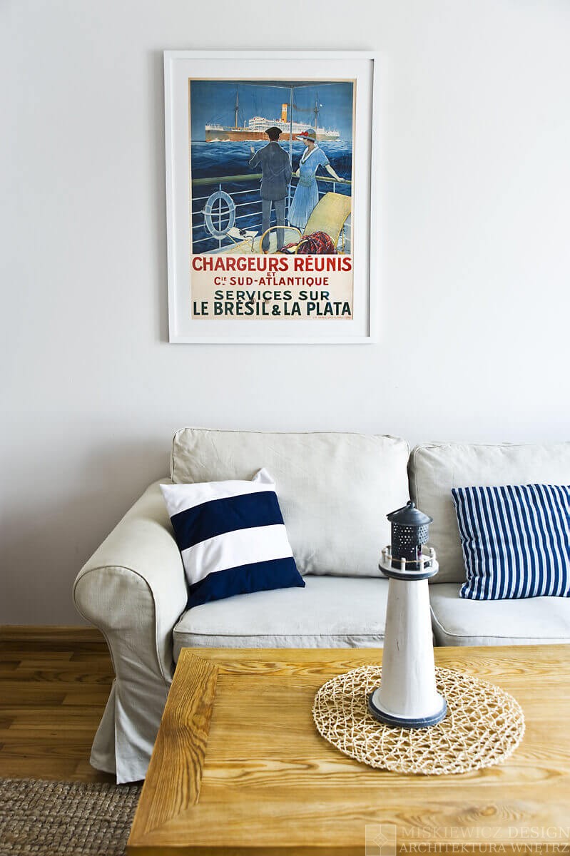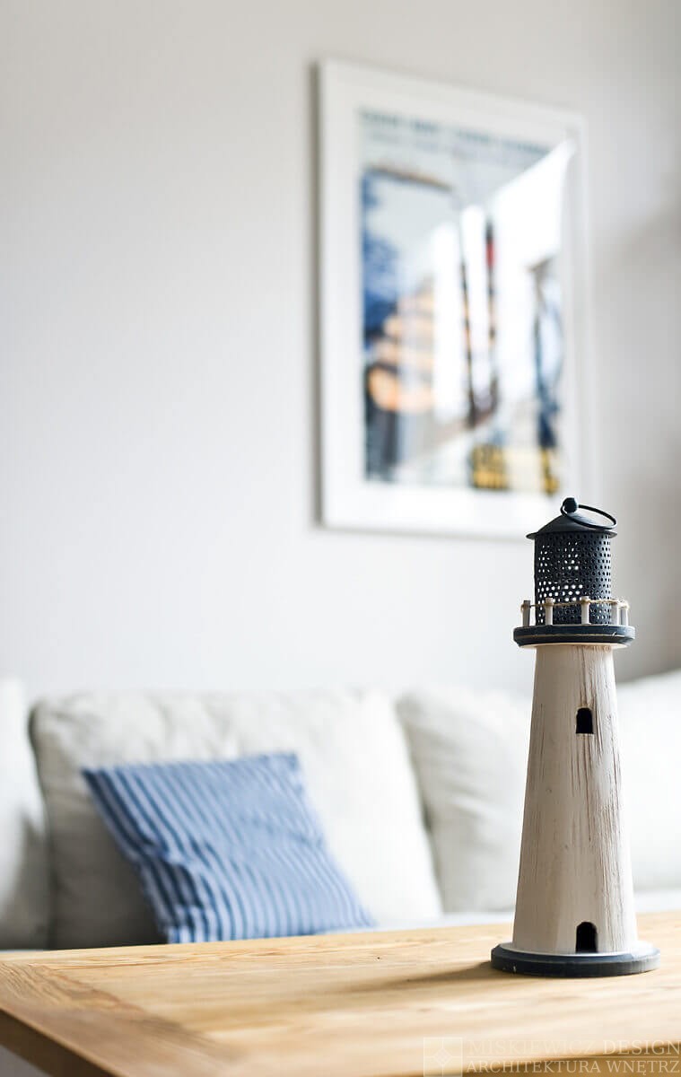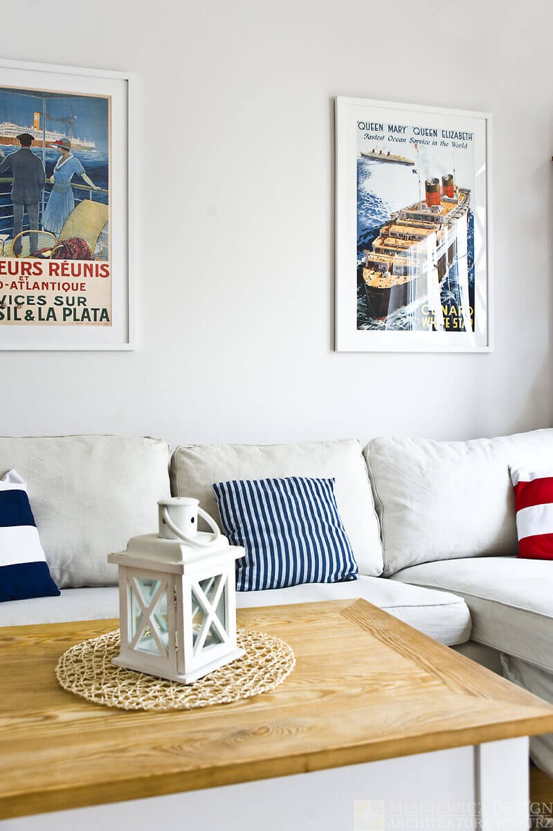 Przez kilka tygodni powstawało komfortowe, naturalne wnętrze wypełnione paletą jasnych barw przełamanych pasami żeglarskimi, dekoracjami marynistycznymi., muszlami i lampionami.